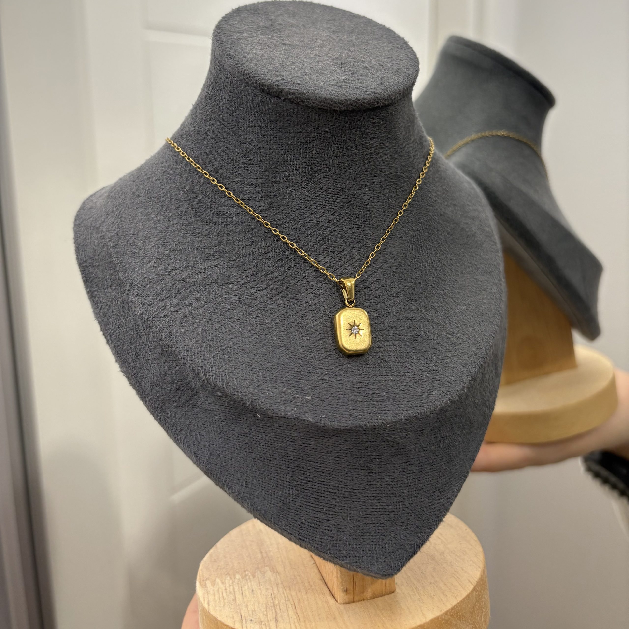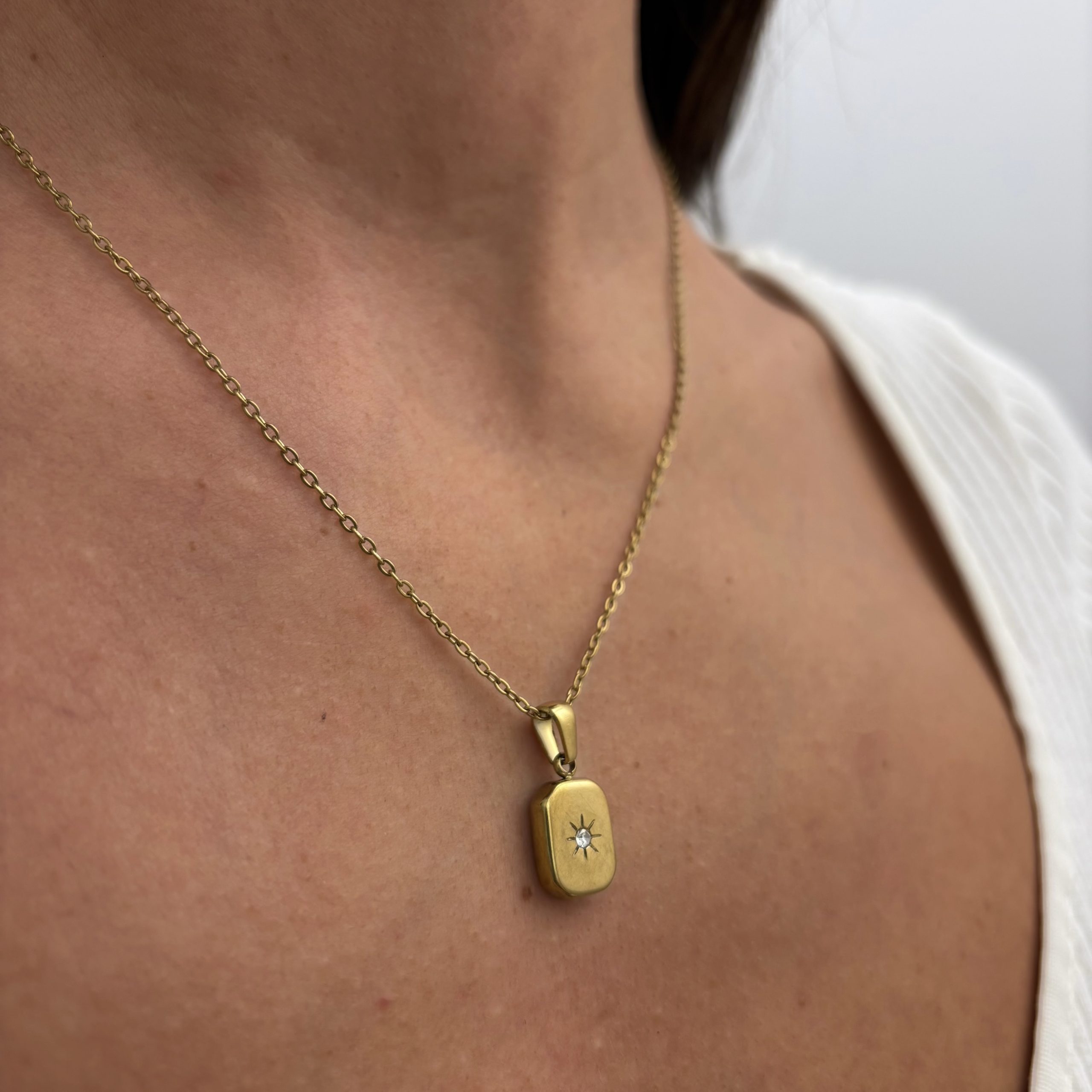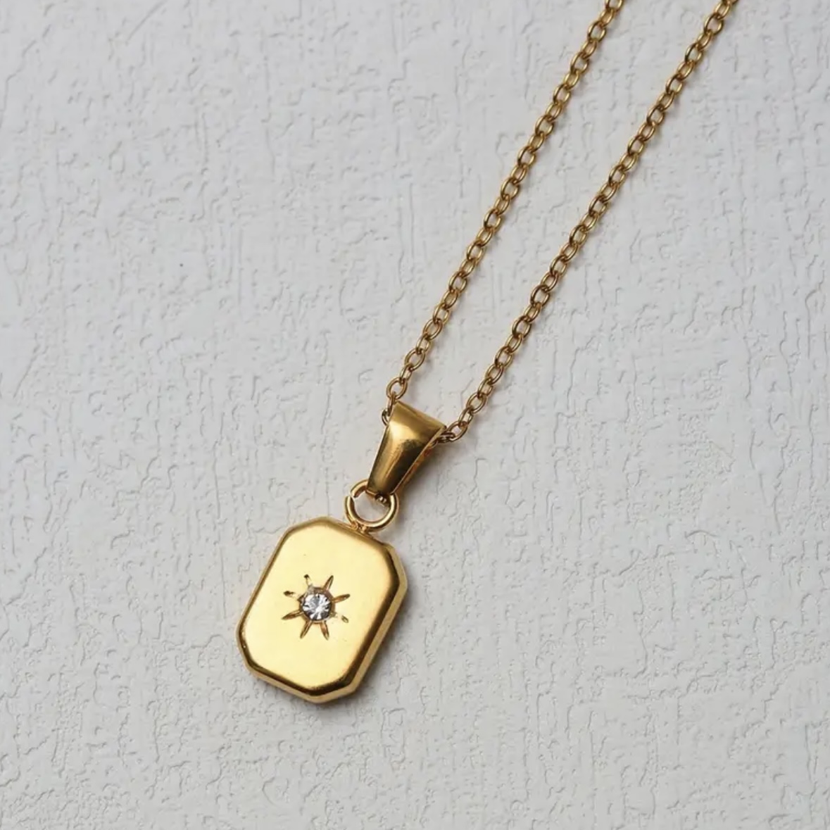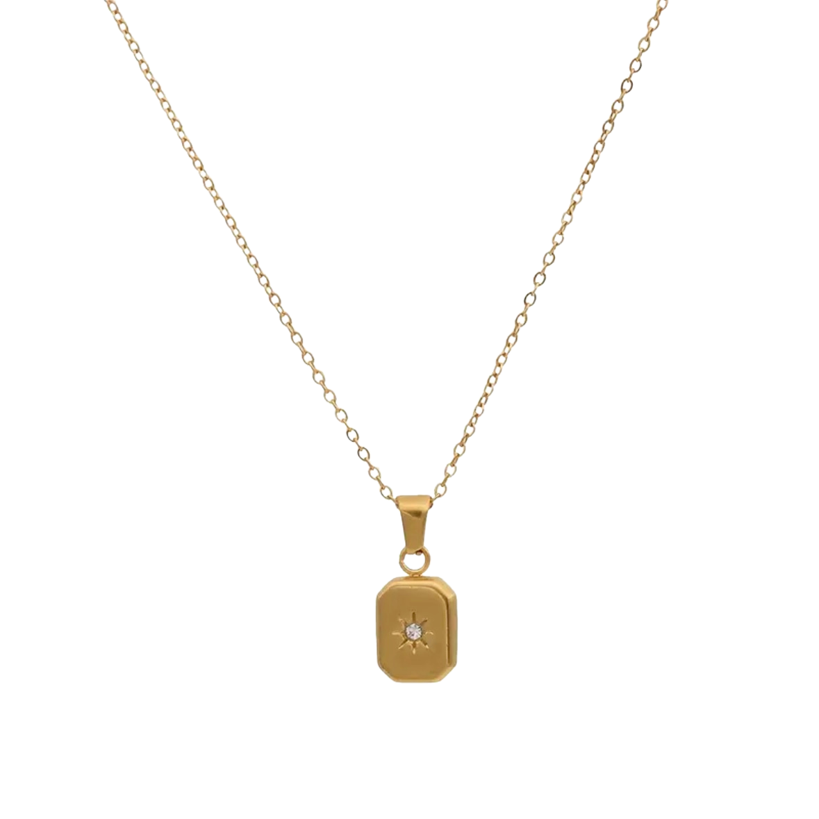 Pravougaoni privezak sa utisnutom zvezdom i cirkonom u centru simbolizuje svetlost, snagu i jedinstvenost, čineći ovu ogrlicu savršenim izborom za svakodnevno nošenje ili posebne prilike.